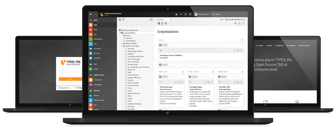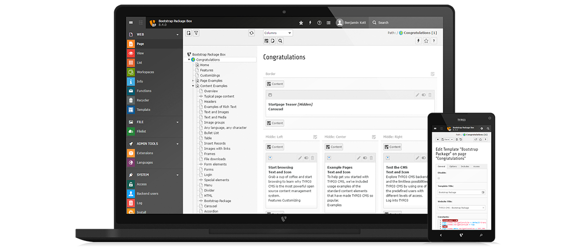 Use TYPO3 CMS as the content management, business logic, and content provider for native mobile applications and front-end frameworks, as well as fully-responsive websites for website visitors and admins.